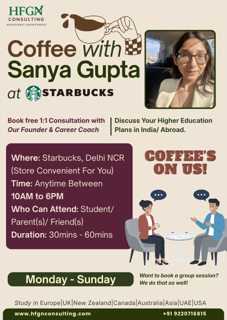 Coffee with Sanya is a relaxed, in-person higher education consultation hosted by Sanya Gupta, Founder & Career Coach at HFGN Consulting, where students and parents can discuss study plans in India or abroad over coffee in Delhi NCR. The session is complimentary (coffee included) and designed to provide personalised guidance, clarity, and strategic direction for educational pathways.