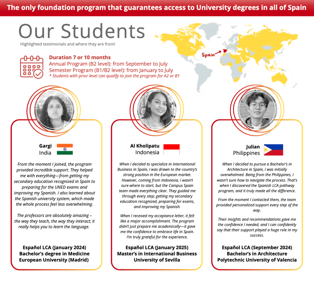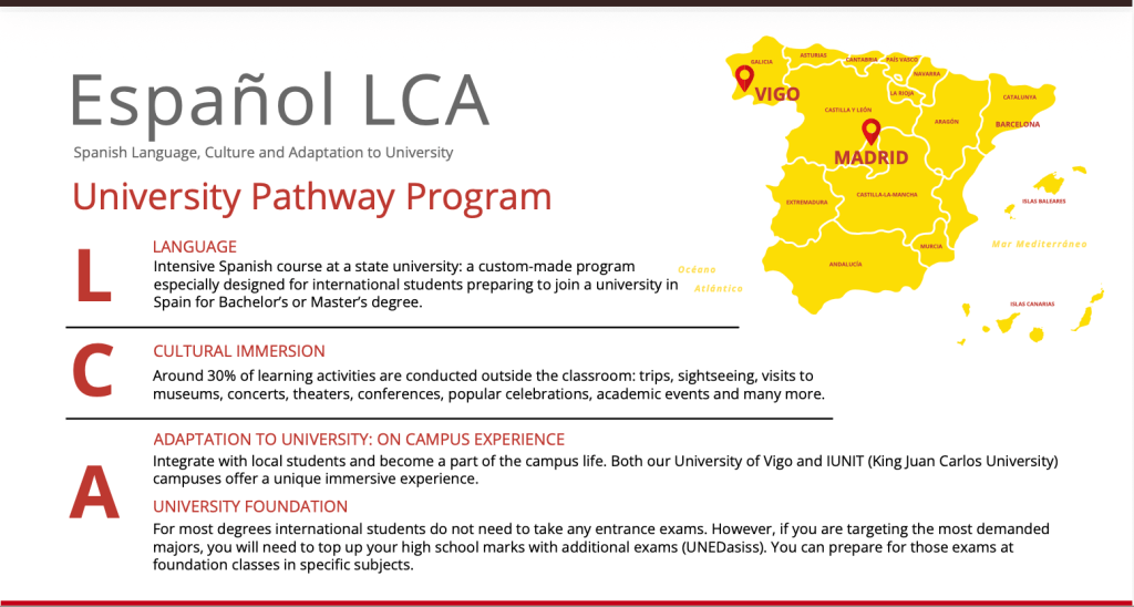 Spanish LCA is currently the only structured foundation pathway that provides access to university degrees across Spain, including public institutions.